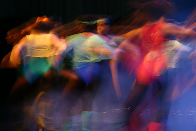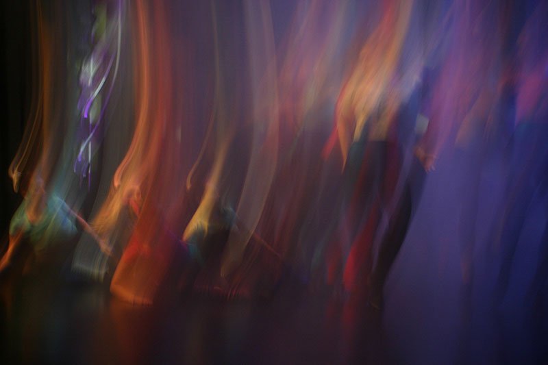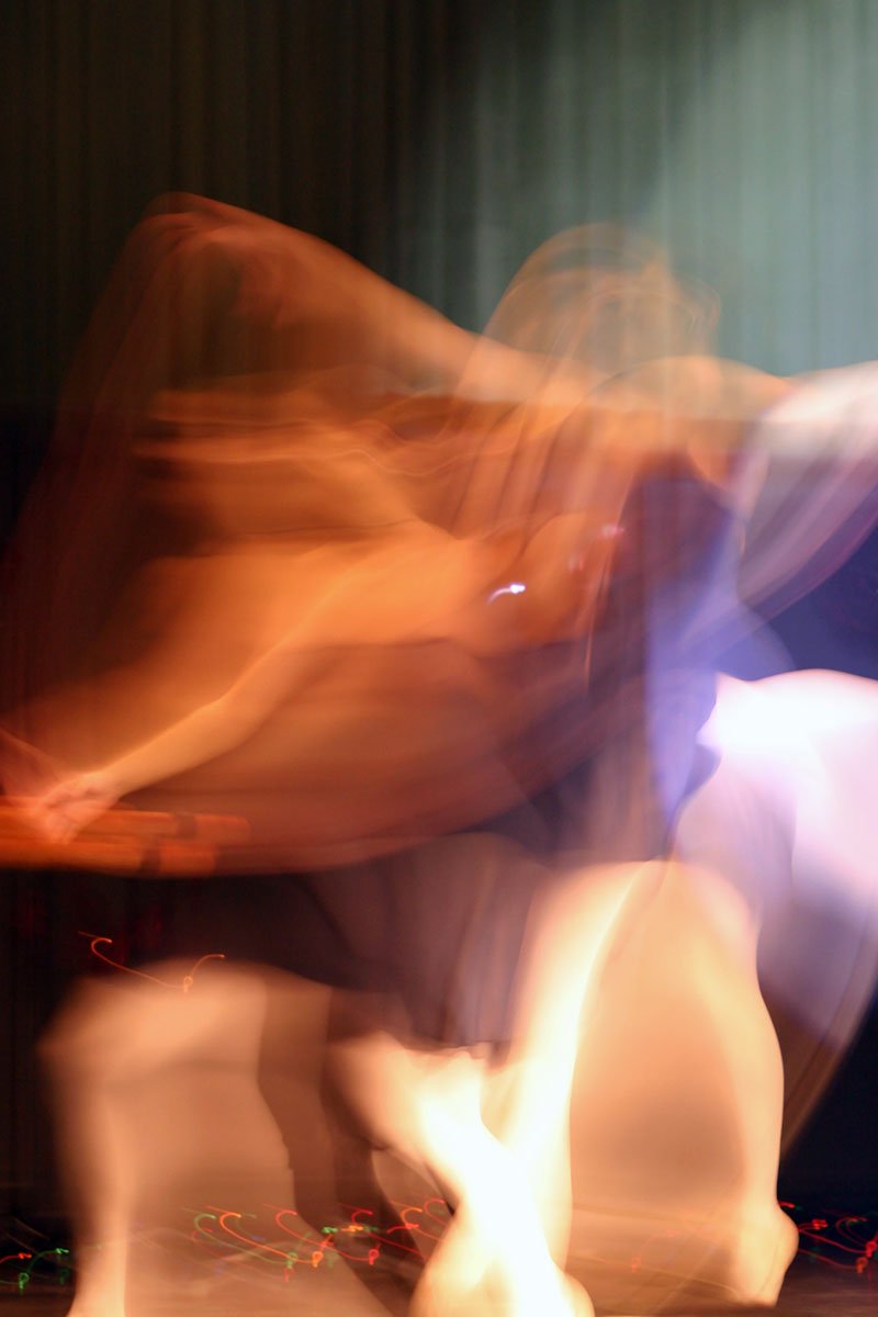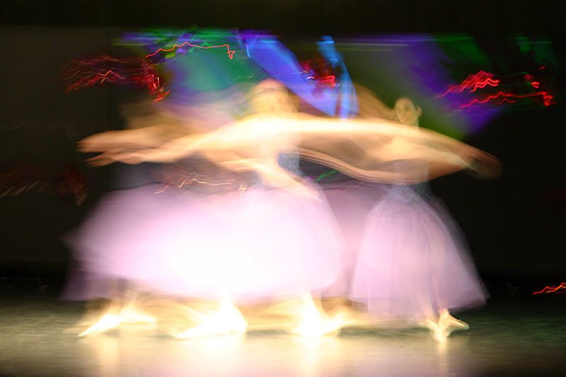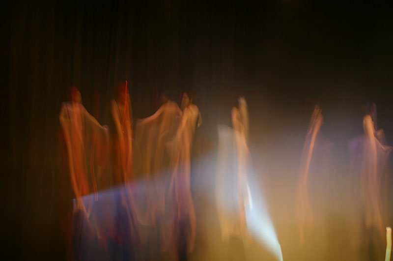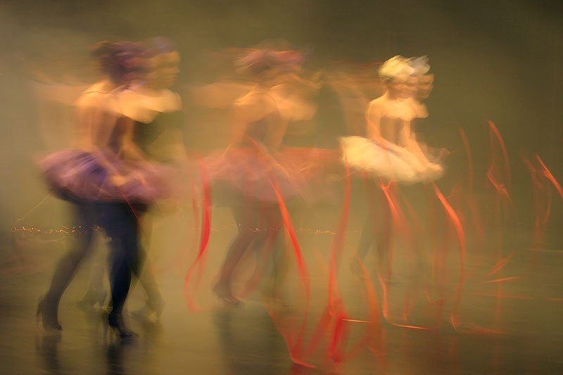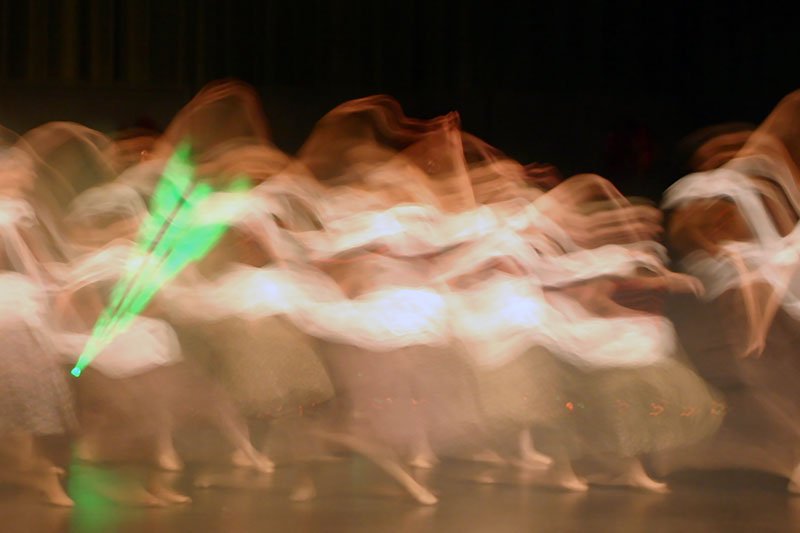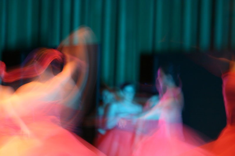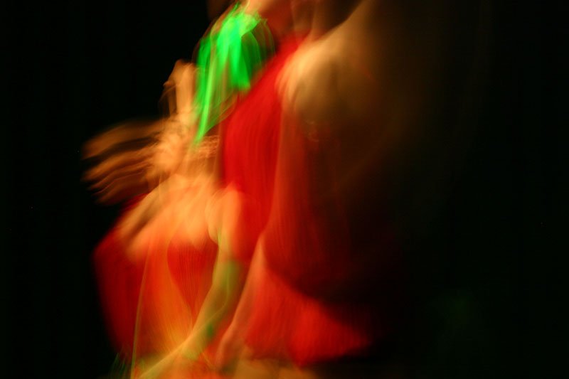 En estas ocasiones en las que tengo oportunidad de realizar fotografías en espectáculos de danza observo por el objetivo y en ocasiones me dejo llevar por la música que suena que me provoca a “bailar con la cámara”. Por eso no son las bailarinas, ni es la danza lo que estas figuras representan, si no la música y el sonido, algo supuestamente impensable en fotografía.